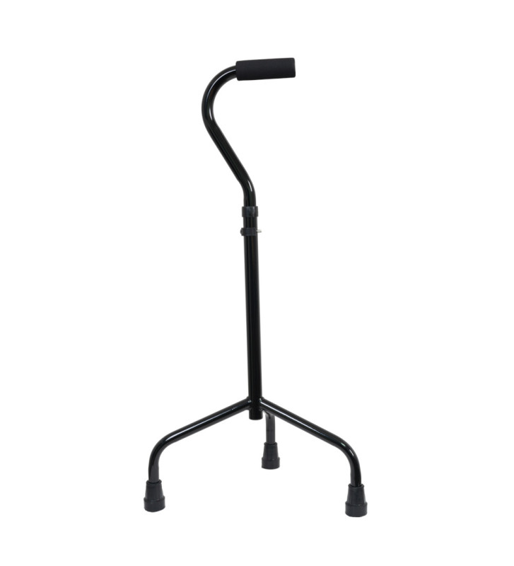 Con dos conteras en la parte posterior y dos ruedas en la parte delantera. Las ruedas permiten que el usuario, simplemente arrastrándolo, se sienta seguro y no tenga que soportar su peso sobre él.